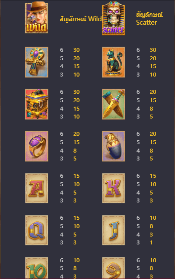 • ตัวอักษร A , K , Q  มีอัตราจ่ายเงินรางวัลที่ 6 ภาพ = 15